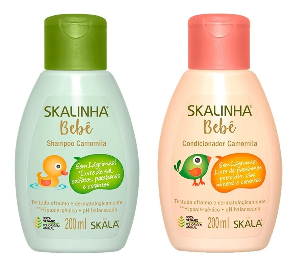 El Champú y acondiconador de Manzanilla Bebé Skalinha está libre de sal, sulfato, parabenos y colorantes. Con fórmula hipoalergénica e ingredientes naturales, no irrita los ojos y la piel de los más pequeños. Limpia suavemente las hebras, dejándolas suaves, sedosas y brillantes.